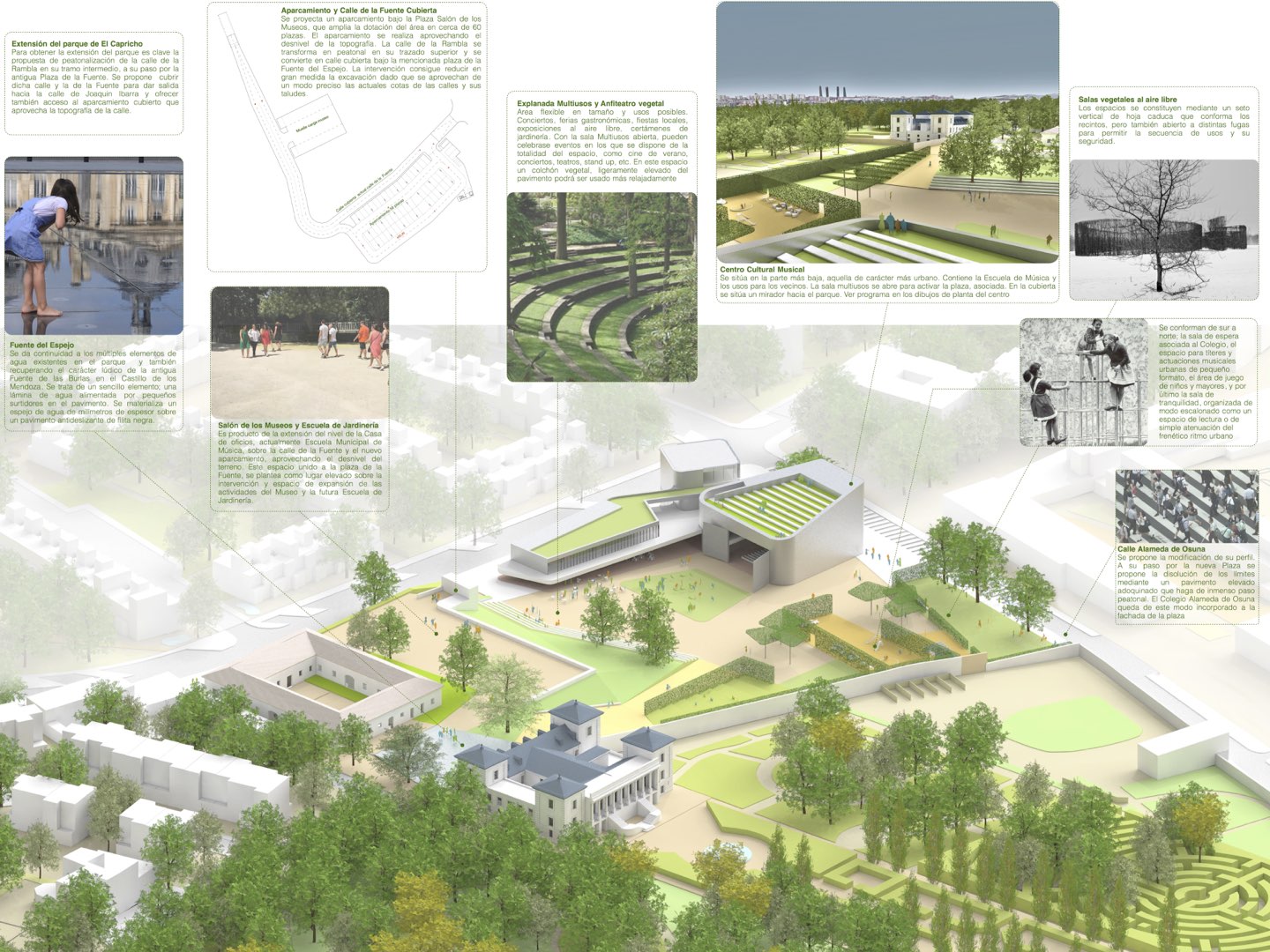 Los elementos de la intervención son : 1.El nuevo Centro Cultural y Musical con su sala multifuncional, 2 La modificación de la calle alameda de Osuna, 3 Las alas vegetales al aire libre, 4 La Explanada Multiusos y el Anfiteatro vegetal, 5 El salón de los museos y la Escuela de jardinería, 6 La nueva fuente del Espejo, 7 El aparcamiento y la de la Fuente semicubierta